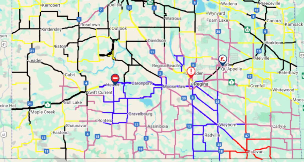 截至中午,埃斯特万(Estevan)周边多条高速公路已因结冰关闭;穆斯乔(Moose Jaw)以南及西南区域的多条道路也被列为不建议通行。